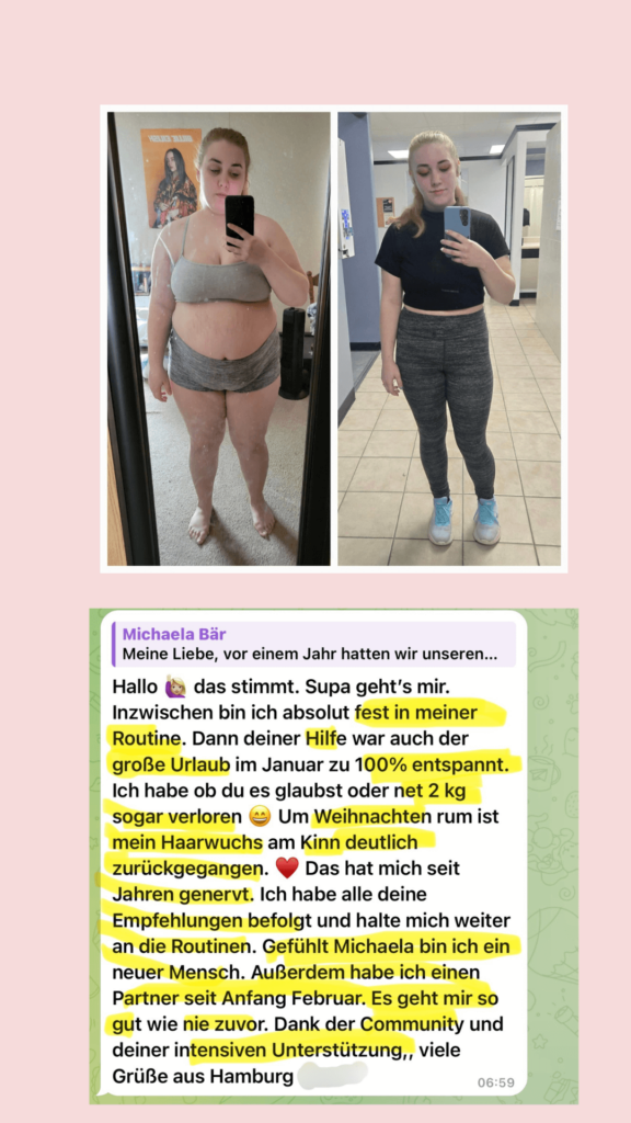 Wir treffen uns regelmäßig LIVE per Zoom und tauschen uns aus. Du bekommst Kontakt zu Frauen die wie Du betroffen sind von Kiwu, Gewichtsproblemen oder PCOS Symptomen. Dieser Kontakt ist das Wertvollste überhaupt! Du bekommst so einmalige Tipps und kannst endlich frei und offen über all Deine Sorgen sprechen, von Verlust der Libido, über Heißhungerattacken bis zu Hirsutismus. Wir sprechen offen über alles. Das stärkt, gibt Kraft und Zuversicht, dass auch Du etwas positiv verändern kannst.