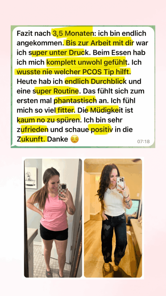 Was mich von anderen PCOS Coaches unterscheidet ist, dass ich da war wo Du heute stehst. Ich habe 7 lange Jahre Kinderwunschzeit hinter mir und über 20 kg abgenommen, mein Haarausfall war so schlimm, dass ich zeitweise Perücke getragen habe.